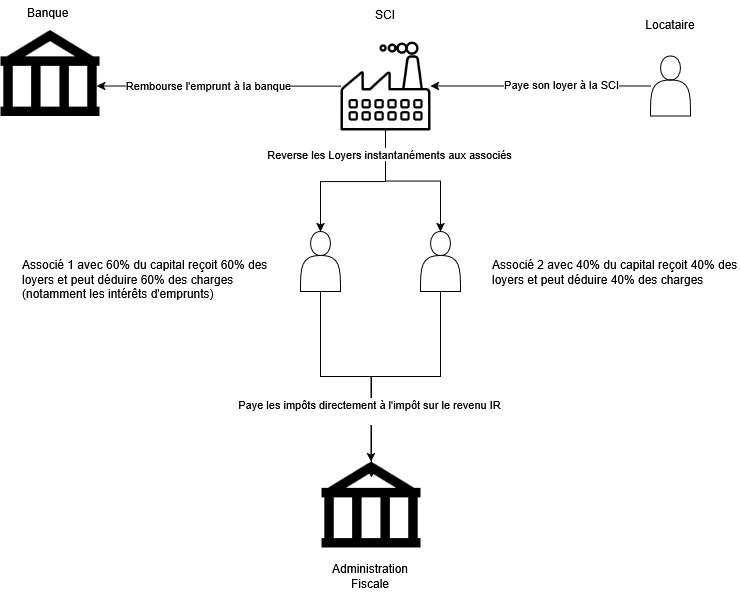 • Les revenus locatifs (ou autres revenus immobiliers) sont « remontés » à chaque associé, proportionnellement à ses parts, et imposés dans la catégorie des revenus fonciers au barème progressif de l’impôt sur le revenu, plus les prélèvements sociaux (~17,2 %)